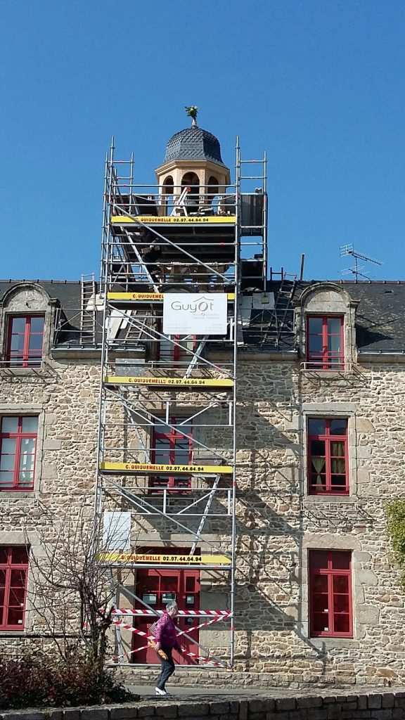 Posé sur le faîte du toit de l’office de tourisme, le campanile de Muzillac a été restauré en 2016. L’entreprise Guyot avait en charge la réfection de la charpente. Un travail délicat et minutieux pour nos charpentiers soucieux de redonner ses lettres de noblesse à l’édifice datant du début du XIXe siècle.